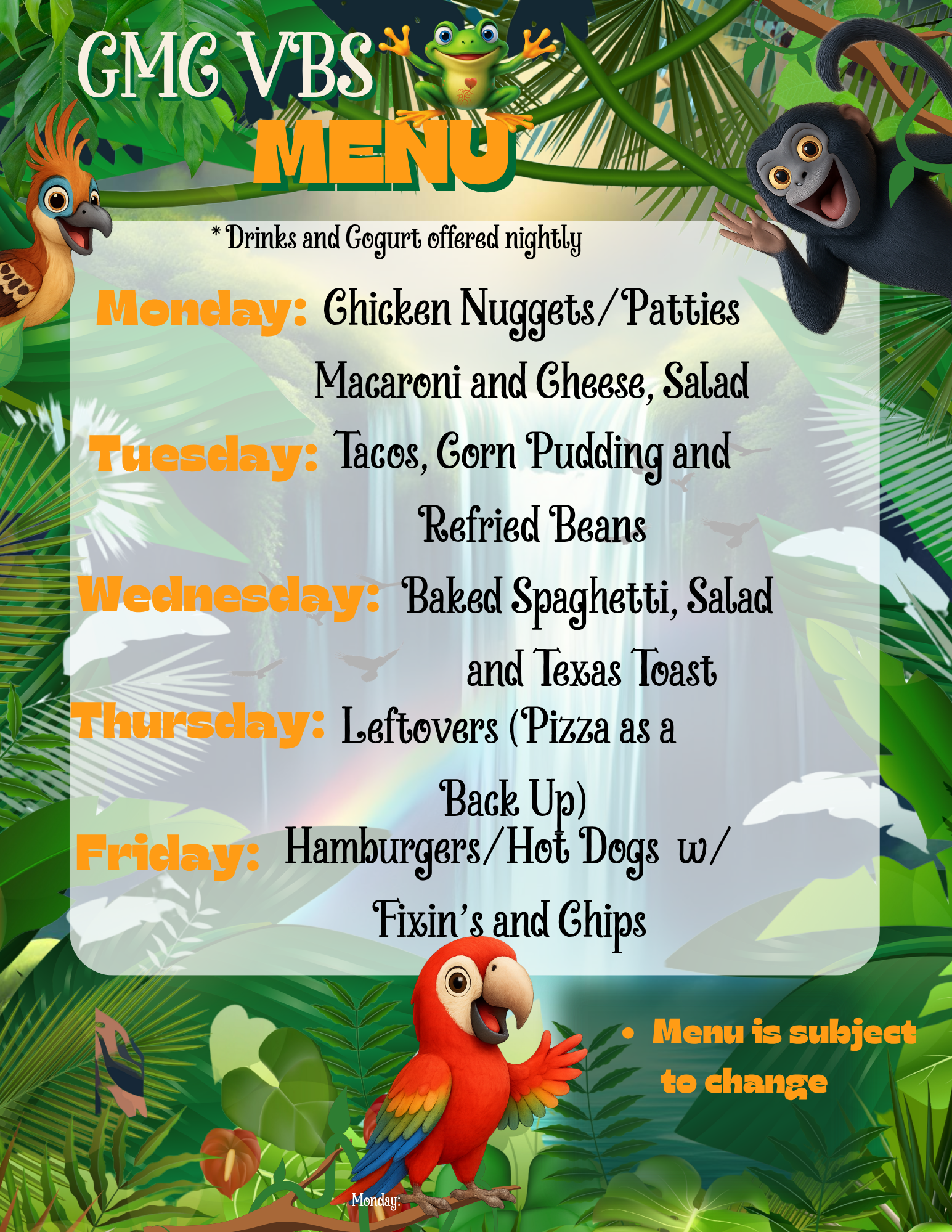 This is where you will find our VBS Menu, Dress Up days and other info that may be helpful.